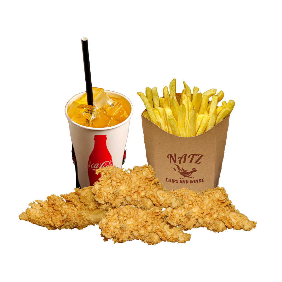 4 crispy strips 200g, cartofi 100g, bautura 400ml
