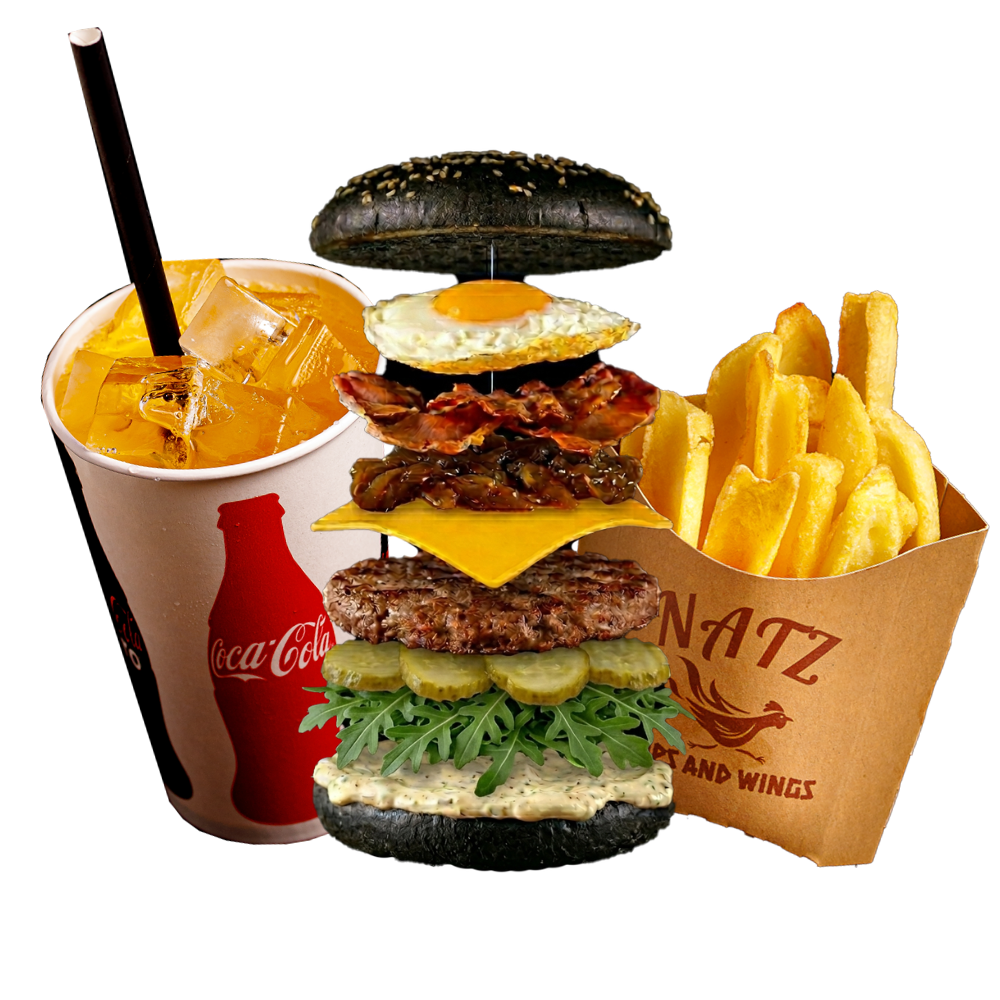 Eggcellent burger 320g, cartofi 100g, băutură 400ml