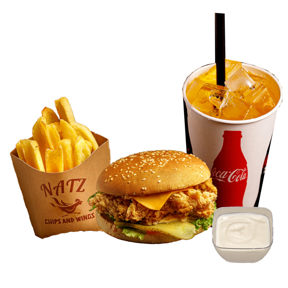 Strip Burger 270g, cartofi 150g, bautura 500ml, sos 60g